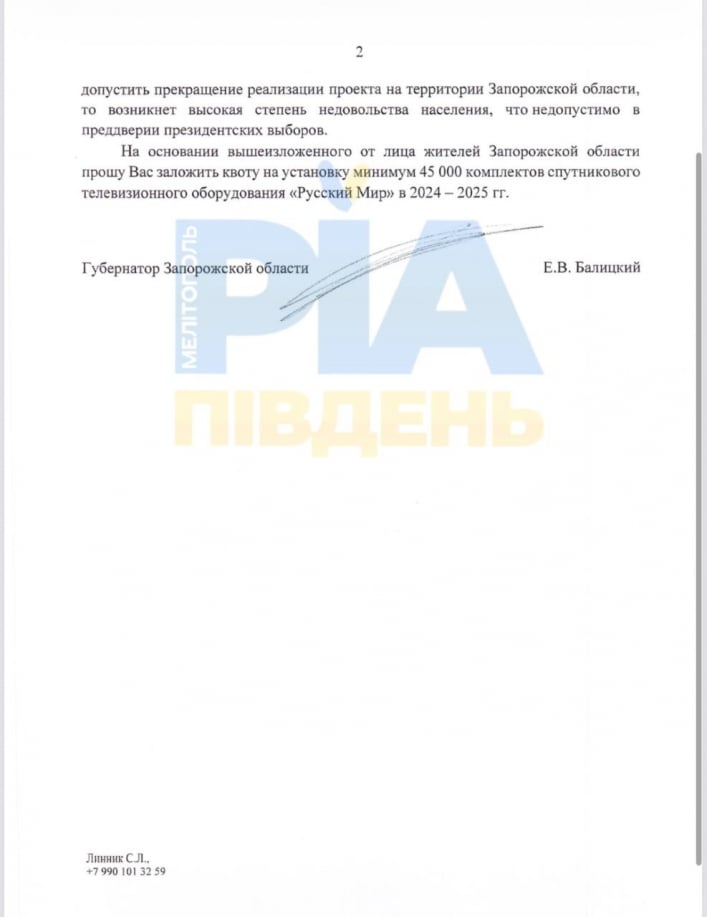 Ситуація виглядає особливо іронічно на тлі зусиль гауляйтера Євгена Балицького з тотальної «теле-окупації» регіону. У розпорядженні редакції РІА-Південь є лист Балицького до віце-прем'єра РФ Марата Хуснулліна, в якому той просить передати 45 тисяч комплектів «Русского мира» для заміни українських антен.