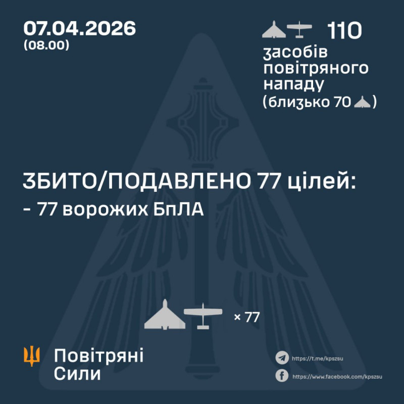У ніч на 7 квітня російська армія запустила по території України 110 безпілотників. Сили ППО знешкодили 77 із них.